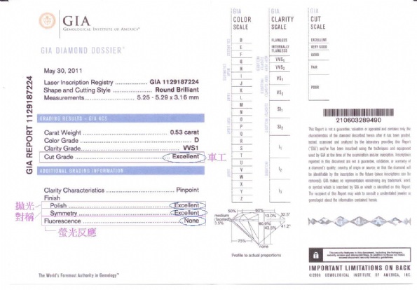 1、證書裡面的Cut Grade(車工)、Polish(拋光)、Symmetry(對稱)是否都是Excellent,三項都有達到Excellent,就是我們俗稱的3EX。