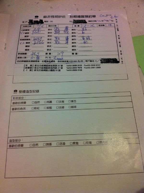 我和帥是在板橋一間知名且多館的婚社社拍婚紗,一開始接洽的門市小姐(以下簡稱E)還不錯,不會強迫推銷,事後也沒有奪命連環CALL,所以我們選擇了它-蘇XX,一開始E跟我說2樓拍照的禮服全不加價,但我去挑的那天,禮祕卻告訴我:「這裡是要加價的喔!」〔我忍~~〕事後我跟E反應,她說:「很抱歉!讓你感覺到不舒服,到時你挑新娘服時,會讓你挑未開放挑選的新娘服。」唉~我能說什麼,我只好答應,心裏也很清楚,即使是舊款,你告訴我是新款,我也不知是真是假啊!禮秘又說我的身材不適合穿修身飄逸的禮服,我也就沒挑了,所以我4件都是澎澎紗的,一點變化性也沒有。