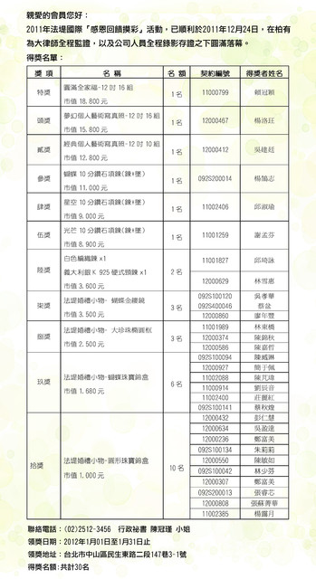 【法緹.新絲路】法緹2012年感恩回饋摸彩得獎
