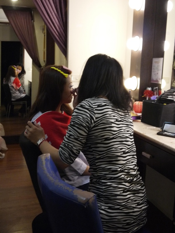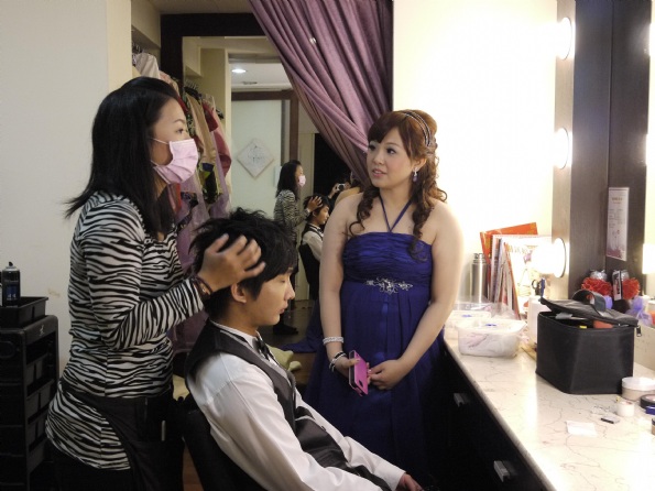 在行前出發前,我們到JOJO婚紗挑好喜歡的禮服後,並和攝影師溝通好前往拍攝的內容和風格後,依照約定的時間內,我們早上八點就到JOJO婚紗化妝做造型。造型師Sindy是個很年輕可愛的女生,化妝的過程很細心,手很也巧,做的造型都很適合我們。