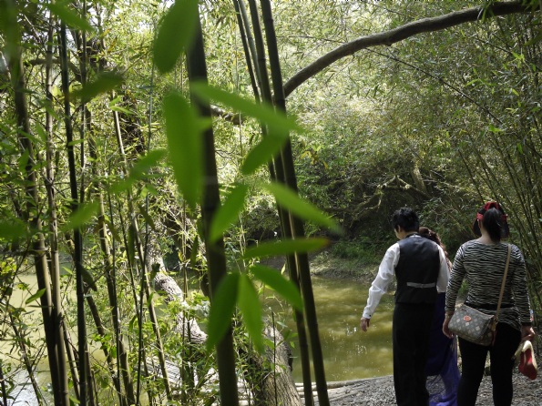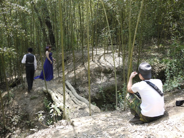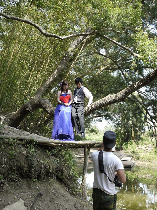 我們今天的場景有的在湖邊樹幹上、竹筏上。雖然有些地方看起來有些小危險,但應攝影師要求下,應該是會拍出很美麗的景色。
