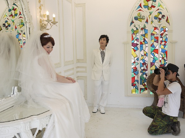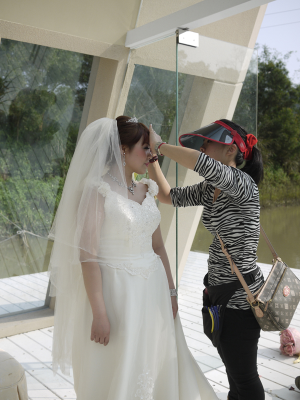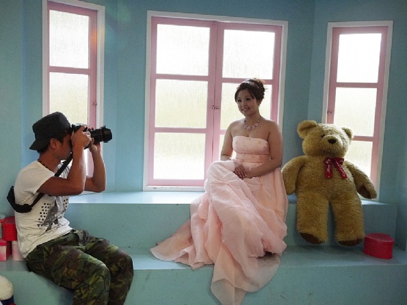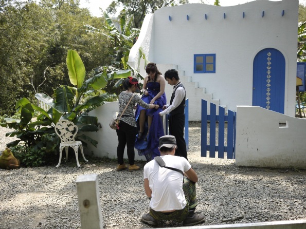 我們今天的目的地是前往三義的格林童話村,聽說那裡是個專為婚紗設計的場景。有很多很美又很漂亮的場景。化好妝也做好造型後,我們就前往目的地。到達定點後,我們跟隨著攝影總監的腳步,至指定的位置上定位。由於地面上不好走動,因此總是在定位後才換上高根鞋,為了就是預防滑倒受傷,那就不美麗了。