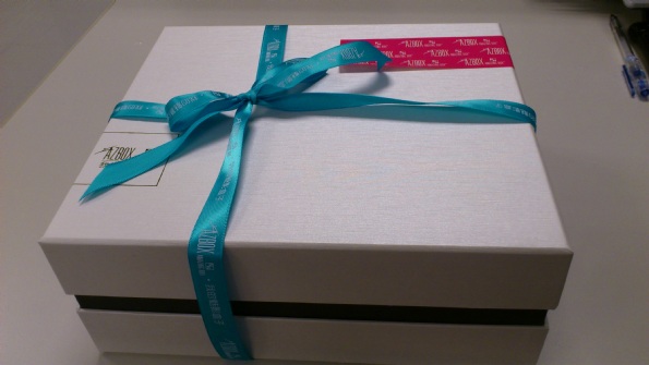 首先,映入眼簾的是土耳其藍的緞帶, 亮而不俗, 上面的魅麗字型也很有質感…..再來,看到盒子也是顛覆我的印象~ 超有質感的設計, 簡單卻不失它的貴氣….有著髮絲紋路的外盒更是增添它不少奢華的魅力………