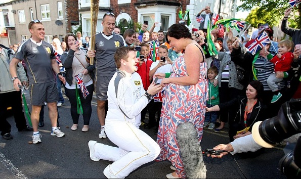 倫敦奧運聖火傳遞隊伍行經英國約克郡(Yorkshire)北部的小城鎮時,手持聖火緩步慢跑的史泰特突然停了下來,迎向路旁觀禮的女友,並且單膝下跪,拿出戒指求婚。