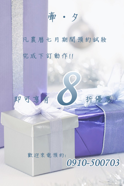 七夕情人特別活動開始囉!!! 凡是農曆七月期間.新人預約試妝 即可享有8折優惠 有任何疑問歡迎來電詢問
