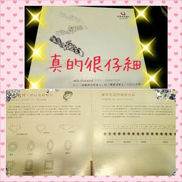 我跟張先生真是太有默契了 ,一眼就看中我們倆人都喜歡的款式!重點來了,我們可是有做功課的呢!張先生問了顏色和乾淨度,網路上看到的問題.....想到就問,專業就是專業,小姐不但一 一回答我們,還專業的為我們說明鑽石品質。詢問了我們想要的鑽石大小、價位、原本一直以為一定要挑D COLOR、淨度也要最好的(因為不懂,以為這樣買才對)但小姐很直接的跟我說:[當然您所想要選擇的品質一定要是最高等級的,但我們了解您應該也會希望可以在理想的價格上挑選到完美的品質;尤其我們挑選的鑽石全部都由GIA鑑定師再次的為顧客把關嚴選,在車工、對稱、拋光各方面都是Double check。所以你們可以很放心的挑選,而我為您介紹的等級也在透明無色高等級Fcolor,淨度VS2,主石:0.52cts.她還細心拿鑽石介紹書來為我們說明為什麼幫我們挑選這個鑽石,細節細到連這個小東西的完美比例她都一一為我們介紹說明(哇!連這麼小的燈西學問也那麼多~) 講到連最難處理的張先生也感覺想來一顆了~哈哈