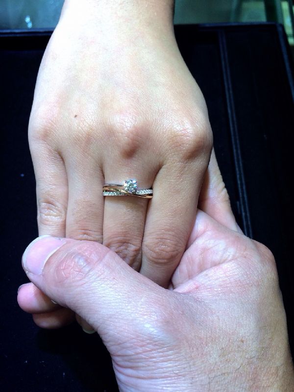 在黃金飾品都選購好後,小姐拿了一款鑽戒給我參考,一開始還在猶豫是否要試戴,原本沒有想要買大顆的鑽石當婚戒的我~被他特別的設計給吸引了,雙色K金與線條感的設計,讓我目光為之一亮,這正是我要的婚戒造型。
