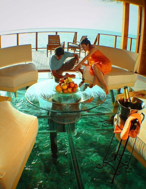 11. 在馬爾地夫,體驗玻璃地板的海上小屋。