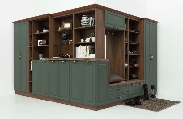 歐式鄉村系列玄關櫃, 擁有一種大器的氣息,這款系統櫃體除了收納功能外, 更在櫃體中附加穿鞋椅凳空間,讓生活更加方便。