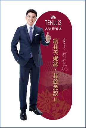 TENLLiS天妮絲名床是水月國際公司旗下第一個自創品牌,已經走過七、八年頭的天妮絲名床,從品牌名字不難看出其女性化的色彩。的確,天妮絲名床成立之初,即設定以女性思維的角度出發,量身打造多款滿足女性喜好的系列商品,這也是台灣寢具業界的創舉。不過,顛覆過往著重女性品牌的刻板印象,今年改走知性的風格,更首度邀請「名節目主持人謝震武」,擔任天妮絲年度品牌代言人,希望藉由名節目主持人謝震武的專業形象、生活品味與認真工作的態度,為品牌注入新的生命力,2014年春暖花開之際,有機會吸引消費者將目光投射在天妮絲名床上。