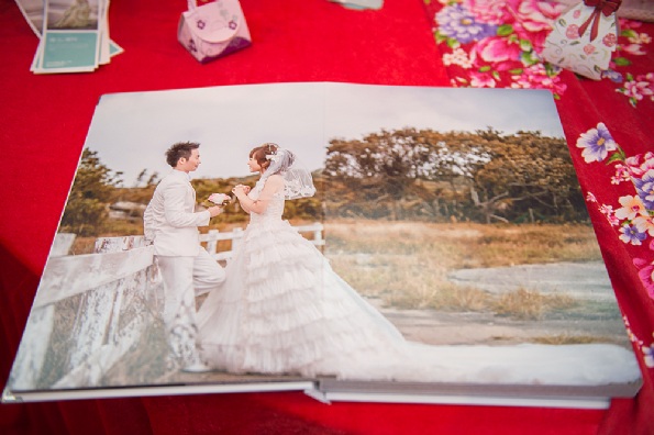 拍完婚紗後,媛琦會利用FB和我聯絡,協助我選婚紗,告訴我修片的進度,她真的很能體諒新娘急著看照片的心,總是會在拿到修改後照片的第一時間告訴我,儘管我一開始不甚滿意色調,又要她們修了幾次,也都不厭其煩地告知我進度,還為我上了螢幕色彩學的概念,讓我可以拿到輸出後依舊亮眼美麗無色差的照片。加利利的相本如她們的風格一樣,不走華麗路線,簡單大方,理念與我想法蠻符合的。不希望婚紗照除了提供宴客當天賓客翻閱外,就永遠塵封在儲物櫃中,因此我很喜歡加利利將相本做成A4大小,好像一本幸福的故事書,擺在書架上隨時都可以讓我回味一番。此外,放大照的輸出,不同於一般將照片鑲於厚重相框中,加利利用油畫的方式輸出,畫面變得柔和,擺設起來富有美感,讓排斥將婚紗照掛在家中的另一半也默許我們婚紗照變成了家中的裝飾品了。