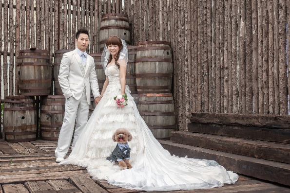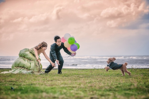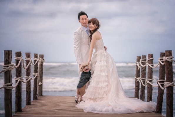 除了我和阿龔之外,其實還有隻特別貴賓狗將與我們一起入鏡,是我家的波波,很多人都說寵物不好控制,所以通常婚紗公司不建議帶寵物一起拍照,我不抱期待地問了媛琦,是否可以帶波波一起入鏡?她很果決地說:「當然好!」於是,拍照前一天,幫波波定裝時,才告訴牠這個喜訊,不意外的牠依舊保有牠的冷靜。