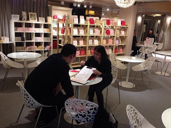 在喜帖陳列架旁,還有擺設許多桌椅,可以同時接待將近10組客人,首先可以先挑選自己喜歡的外卡,然後拿著樣品找一張桌子坐下,再慢慢決定搭配的內頁及細節.....