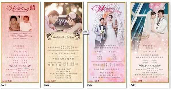 拿著自己選好的外卡之後,內頁 的部分也提供許多版本作搭配,只要內頁同版本100張就免費升級成有照片的彩色內頁,除了背景的花紋有多款,連內文都有許多版本提供參考(結婚、文定、創意內文皆有)