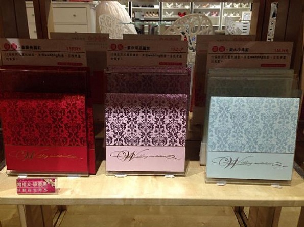 二是沒有那些立體的裝飾品,通常是平面的制式化卡片,價格當然也就便宜一大半,一張12~40元不等,但是在網路上尋尋覓覓,總覺得便宜的喜帖真的就很普通,而且透過電腦螢幕觀看,很難判斷紙張的質感或有沒有色差問題,尤其聽聞有人上淘X網採到大雷的故事,原本在畫面上的精致燙金喜帖,一收到貨打開整個大傻眼,磅數單薄的紙張、甚至內頁是用白紙黑字列印,別說長輩看了一定碎念到不行,自己還得去收拾殘局搞客訴退貨~