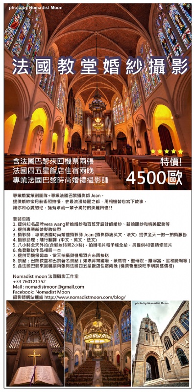 有法國巴黎來回機票2張+法國四五星飯店住宿2晚+法國攝影師親自服務