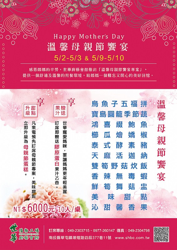 世華廚藝會館推出「溫馨母親節饗宴專案」,提供一個舒適及溫馨的用餐環境