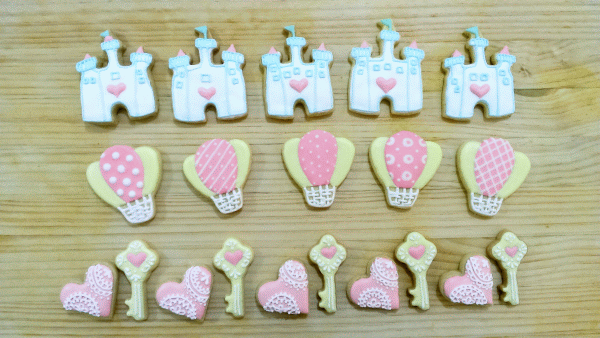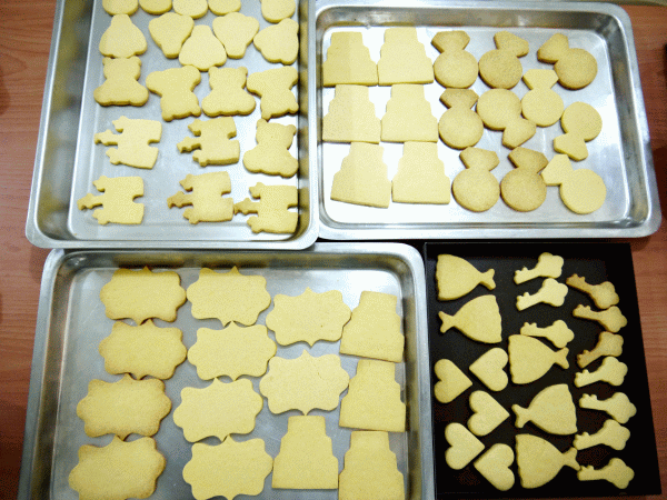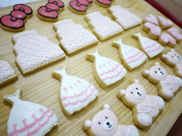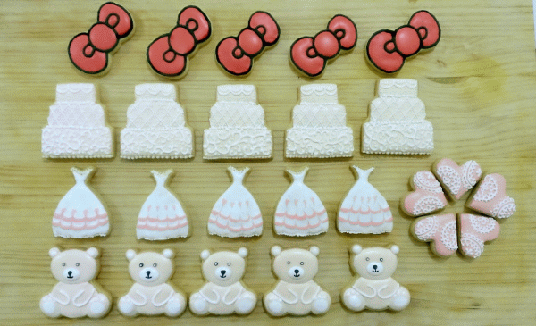 數量決定之後,好友很放心的把餅乾造型交給我設計和決定,讓我自由發揮。為了讓好友的婚宴更添精采,不想把餅乾造型做得太簡單,如此一來每一份的數量就沒辦法做太多(其實一方面時間也不夠啦 XD),所以最後決定每一份內容是6片不同造型的手繪餅乾。