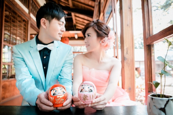 粉橘色的禮服甜甜的,搭配老公天空藍的西裝,很柔和好看,謝謝妹妹和妹婿東京旅遊時買給我們的結婚小禮~幸福達摩