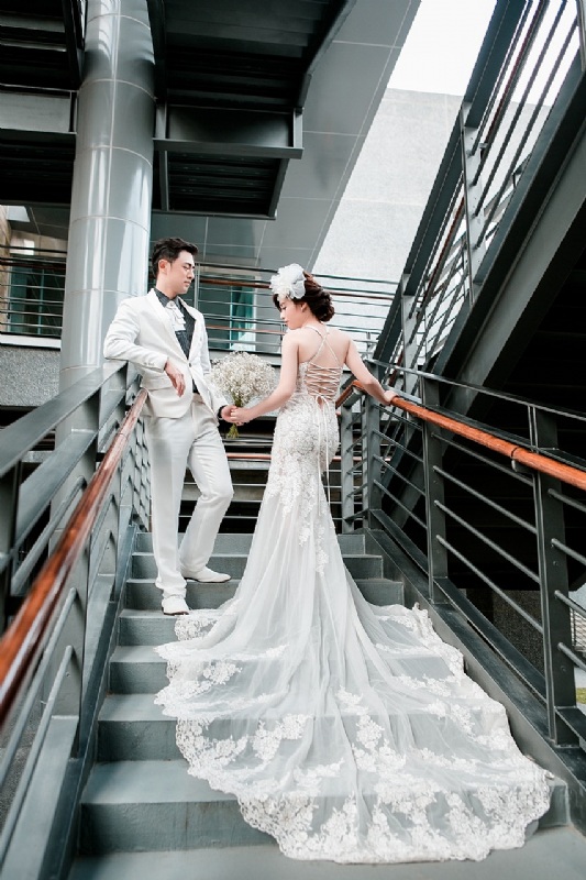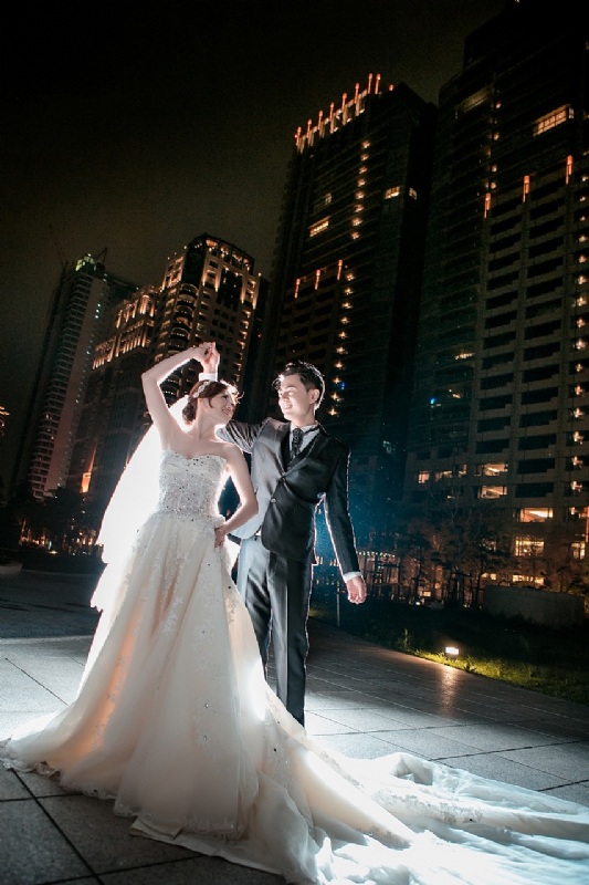 經典的白紗款,是我自己夢想已久的,雖然馬甲束的很緊、胃被壓得不舒服,而且因為裙襬份量大所以還是會往下滑(穿這種婚紗拍攝要小心曝光喔!)雖是如此還是要拍出美美公主風,看著西裝筆挺的老公,自己真的像仙杜瑞拉,夜景是老公很想要的,謝謝攝影師唷!
