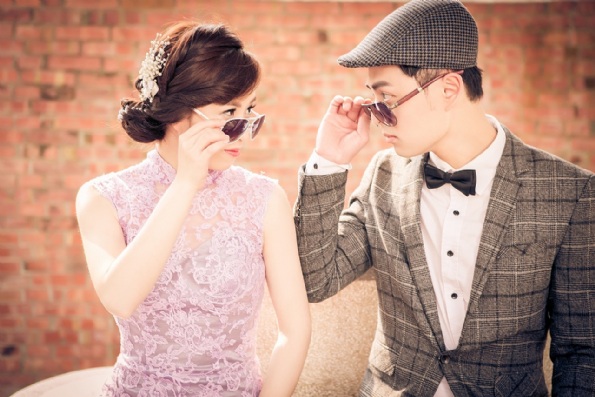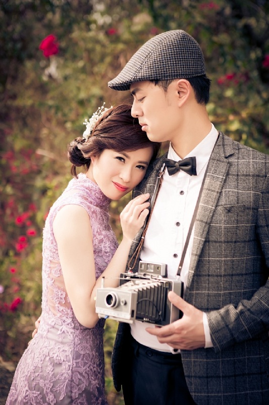 紫藕色的改良式旗袍,當初看到這顏色覺得很奇怪,也因此沒有其他新娘穿出去外拍,但是好家在有試穿,才發現原來還蠻適合我的,這套的復古造型是我和老公最喜歡的,帽子和雷朋眼鏡是自備的。