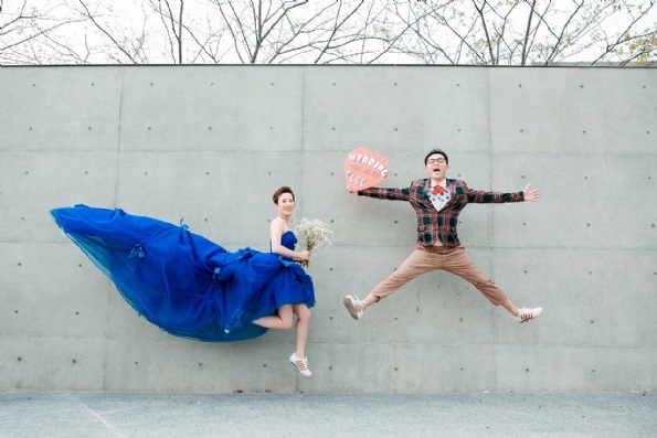 寶藍色的前短後長禮服,裙尾裝飾著很多蝴蝶結,跟很多新人一樣,我們選擇自己的情侶鞋搭配俏皮感,也試了我們拍照時很喜歡的漂浮跳躍喔!