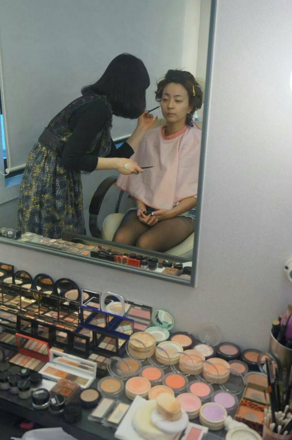 第二天一大早翻譯就到民宿來接待我們 , 帶我們到美容室去化妝,就像電視看到的那樣 ,一整片化妝品擺在桌子前面. 由專業的室長來幫我化妝 . 一層一層疊上妝 ,但畫完妝感又超級清透 , 超滿意的 , 一副韓國人樣子捏~~ 連我老公也是唷 ~~ 整個瞬間變喔霸了!! 超級帥的 ~~~~~