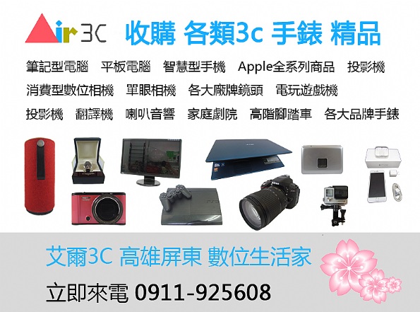 艾爾3c 高雄 屏東0911-925-608高價收購二手單眼相機、鏡頭、DV攝影機、筆電、遊戲主機、手機、液晶電視、蘋果全系列商品(iMac、Mac Pro桌機、Macbook Pro、Air、New iPad、iPad mini 2、mini 3、iPad4、iPad Air 2、iPad Pro、iPhone 6S PLUS、iPhone 6、i6 Plus)、各類3c產品、名牌手錶,其他地區歡迎洽詢0985-000688 艾爾3c