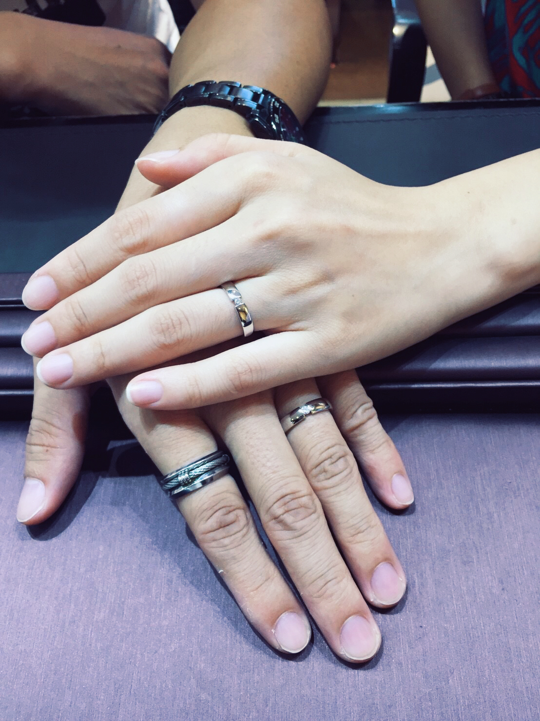 反反覆覆試戴將近10款後,選出了我們一戴就喜愛的兩款,討論後終於下訂了我們的婚戒....