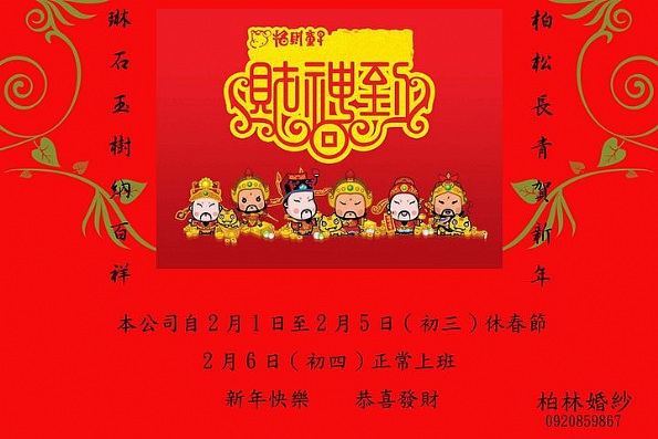 台中柏琳婚紗春節休假公告柏松長青賀新年琳石玉樹納百祥本公司自2月1日-2月5日(初三)休春節2月6日(初四)正常上班⋯⋯ 恭祝大家 新年快樂 恭喜發財