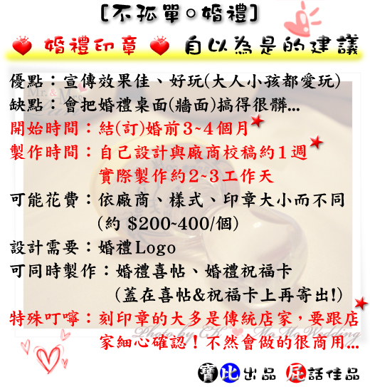 更多詳細的做法及資訊,請大家參考我的[不孤單。婚禮] 婚禮印章一起來分享及推薦吧~~ http://www.wretch.cc/blog/iori9004003/13340514